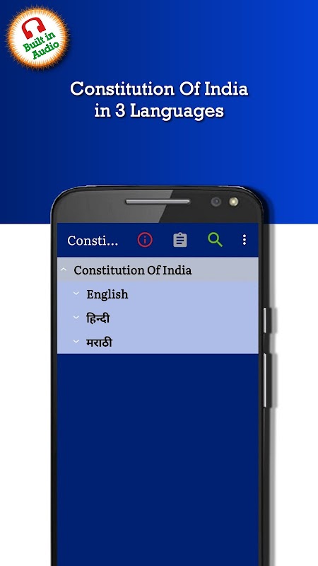 ✓ It is a Polyglot App, i.e., Currently entire Constitution of India is available in English, Hindi as well as Marathi