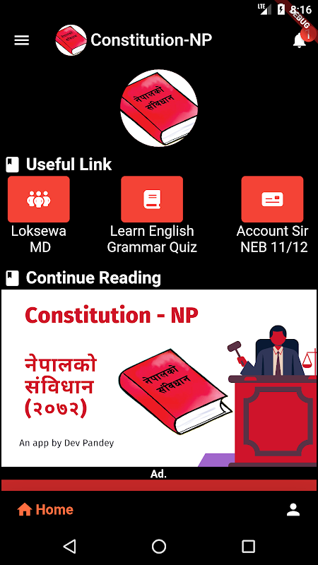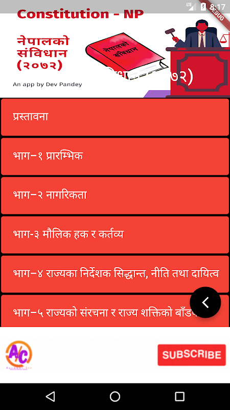 Disclaimer: Dev Pandey is the developer of this ad-supported app. The Law Commission of Nepal's official website provides all of the content for this app. The app's contents are identical to the actual source content. As a result, we bear no responsibility for the content's accuracy or validity. We are not in violation of the copyright policy or the play policy. This app was built solely for educational purposes.