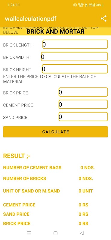 THIS APP IS USED TO CALCULATE cement , sand , brick with price also.