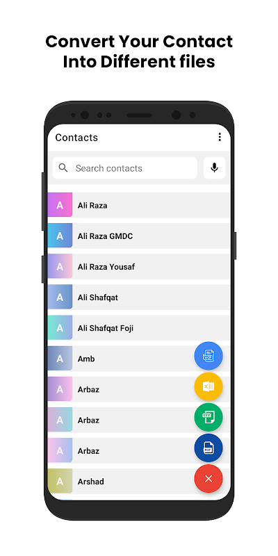 Export your contacts as VCF, CSV, or PDF files and share them via Bluetooth, email, WhatsApp, or other messaging apps.