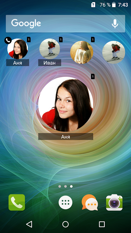 Create a contact icon is as simple as widget. To do this, the widget list, select "BC - Icon" and add to your desktop. You will be prompted to select a contact, define the action by clicking and SIM-card. Contact Icons are limited - they are displayed in a circular picture of contact with the contact name. To combine the icons in a folder, simply drag one icon to another.