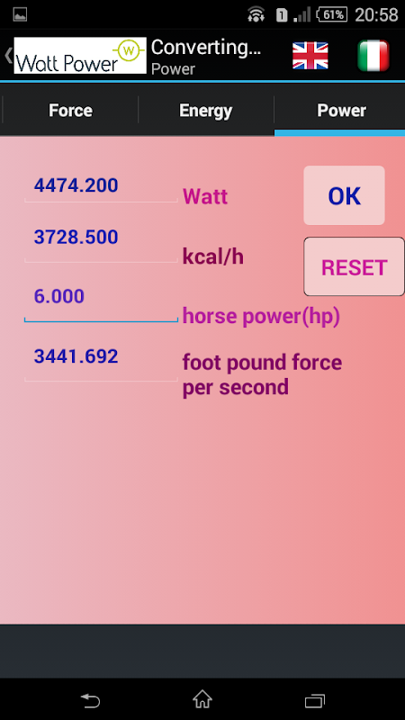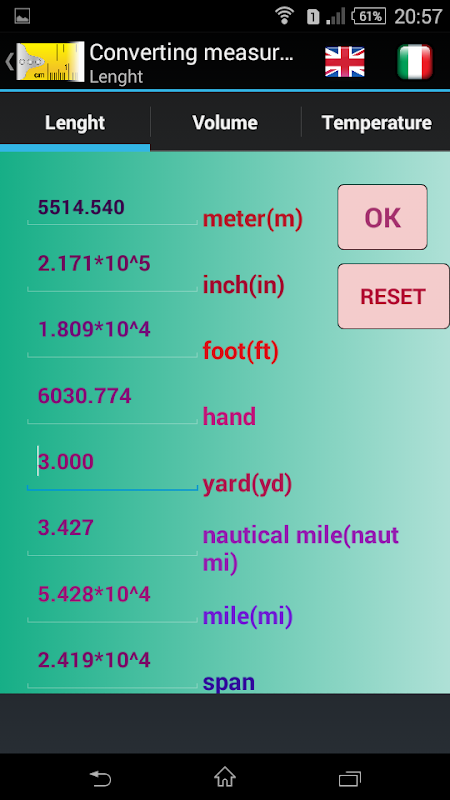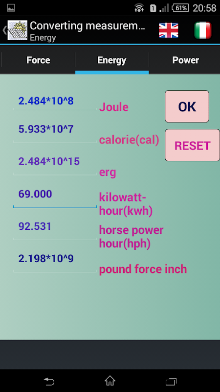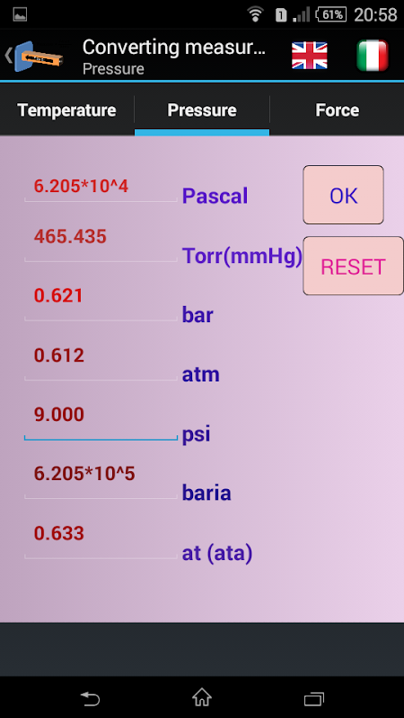 Converts the measurements of the following physical quantities: length, volume, temperature, force, pressure, power and energy.