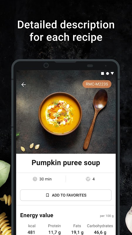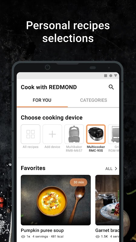 Cooking app with branded recipes from REDMOND for your appliances. Personal selections for any occasion, picking up a recipe for the specific ingredients, list of purchases. Wide range of recipe categories, for everyday or special occasion Picking up a recipe by calories, time of meal, occasion for cooking, national cuisines, diet, preferences and time of cooking helps to provide balanced menu for entire family.