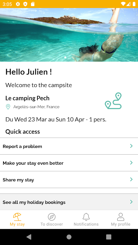 You have just booked your holidays in your favorite campsite. We are pleased to offer you a unique experience to discover before your arrival the services and activities available, inform us of your arrival time to better accommodate you. But also make you enjoy on the spot the best deals negotiated for you by the campsite, be informed in real time about the program of activities, schedules of various services, give your opinion, but also enjoy the exclusive offers offered by your campsite.