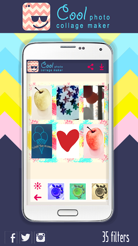Get “Cool Photo Collage Maker” free app for Android™ and decorate your pics with the most beautiful photo frames and add amazing photo filters to enjoy pics art! These photo borders and backgrounds with various colors and patterns will make your pics look fantastic. Dare to enter this fun photo booth and use your beauty camera to make your images look magnificent.