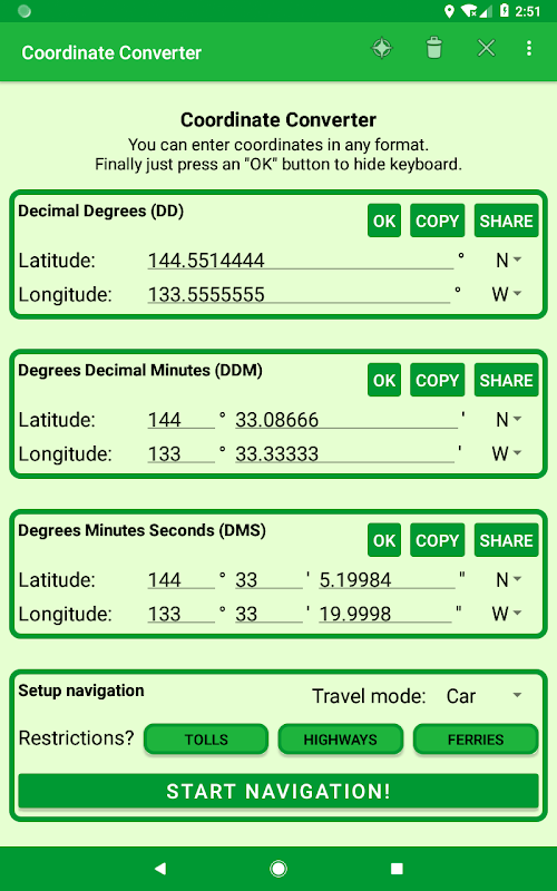 Bonus: This app will also allow you to launch the navigator Google Maps from coordinates. You will be able to setup navigation with typical options.