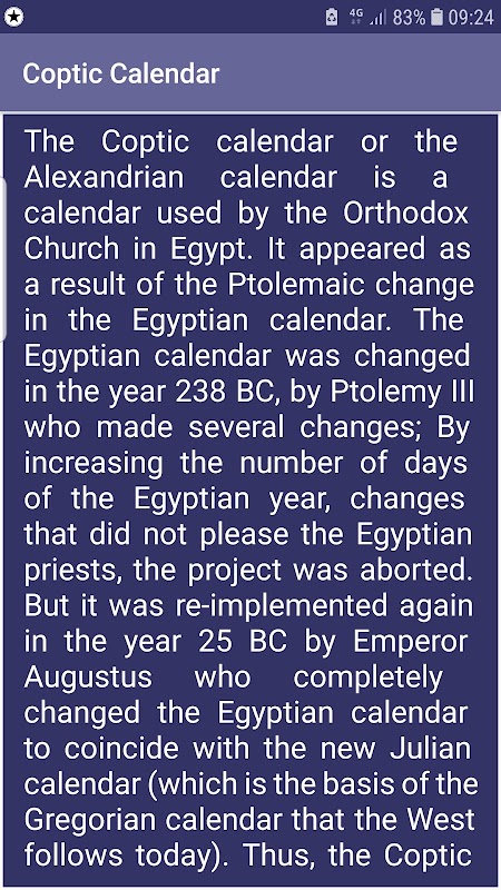 The Coptic calendar or the Alexandrian calendar is a calendar used by the Orthodox Church in Egypt. It appeared as a result of the Ptolemaic change in the Egyptian calendar. The Egyptian calendar was changed in the year 238 BC, by Ptolemy III who made several changes; By increasing the number of days of the Egyptian year, changes that did not please the Egyptian priests, the project was aborted. But it was re-implemented again in the year 25 BC by Emperor Augustus who completely changed the Egyptian calendar to coincide with the new Julian calendar (which is the basis of the Gregorian calendar that the West follows today). Thus, the Coptic calendar, which the Egyptian Orthodox Church operates in until today, came into existence, which differs from the Egyptian Pharaonic calendar.