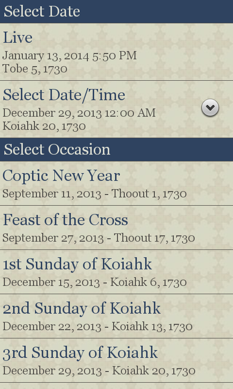 Coptic Reader is a mobile application that contains the liturgical text, rites, psalmodies, hymns, melodies, services, and sacraments of the Coptic Orthodox Church. See below for a full list of included content. Coptic Reader is not simply a text reader but rather it dynamically creates each document/service according to the rites of the current day, or selected day/feast. Coptic Reader builds each document on the fly with all appropriate hymns, rites and instructions to take the guess work out of the order of a church service.