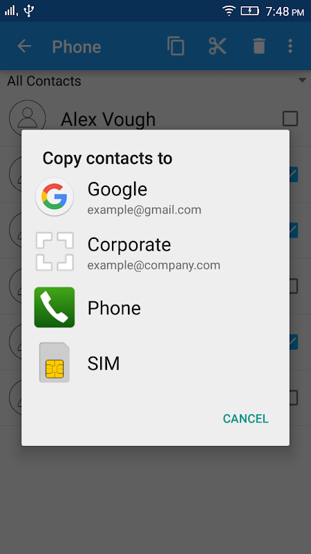Copy or move your contacts from one account to another. For example: from SIM card or phone to Google, from Facebook* to your Corporate (Exchange), from Google to SIM, ...etc.