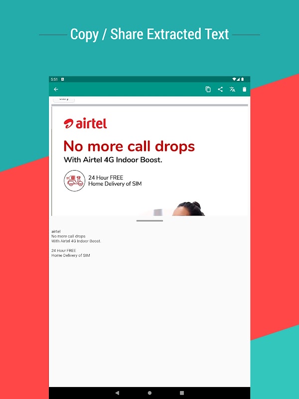 Default long press to copy text on mobile screen not works sometimes there this app helps you to extract text/words from mobile screen by just sharing your screenshot with this app.
