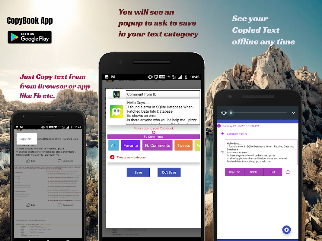 Copybook helps in save others favorite Comments, Tweets, Websites links , Notes, Jokes etc. Just copy text from any application and save in your personalized category name.