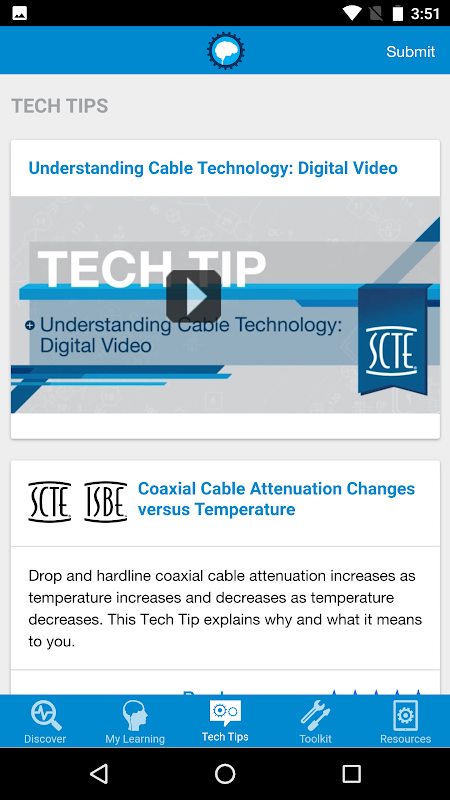 As a benefit of your annual membership, SCTE members can access technical resources, learning material, primer videos, Live Learning Webinars, standards, and more using CORTEX Mobile. Search technical product material from cable industry partners, read industry news articles, and access online course material while you're on the go. Use the Toolkit to get the very best calculators and tools right on your smartphone.