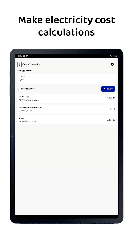 CostAware is a quick and simple electricity cost calculator for calculating electric costs of using home appliances and others. Your list of appliances will be stored on the app and you can quickly check usage cost according to todays electricity unit price (kWh).