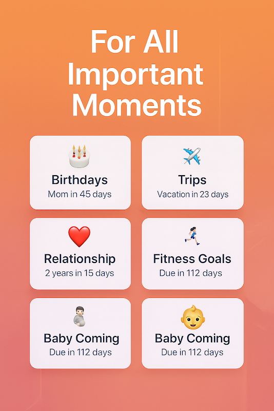 Your Personal Countdown Buddy Never miss a milestone again. Countdown app transforms how you track life's exciting moments with gorgeous, customizable countdown timer widgets right on your home screen. From birthday countdown celebrations to retirement countdown milestones, make every moment count.