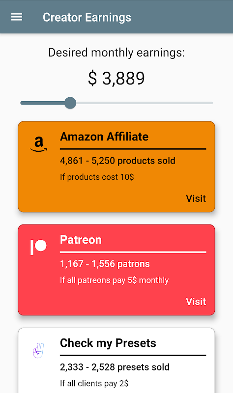 At this moment, the app can help you calculate earnings on these platforms: Youtube, Twitch, Substack, Udemy, Buy me a Coffee, Kindle, Amazon Affiliate, Patreon and Check my presets.
