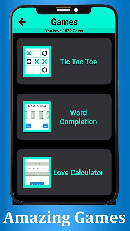 In Credito , we have seven options in Game section in which games like , Reach the Hole , Amaze Line (My Favorite) , Big Reward , 2048 , Tic Tac Toe and Word Completion and remaining one is Love Calculator.