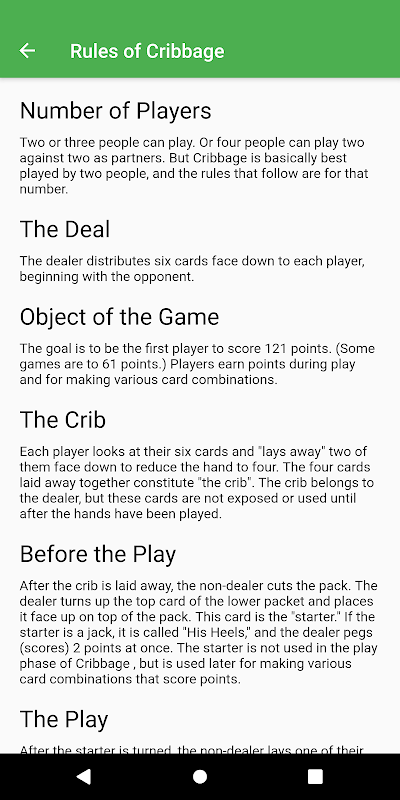 The Cribbage Scoring Pegboard app also includes cribbage rules of the game and a handy cribbage scoring chart for easy reference. Making this a great companion app for playing cribbage. So grab a deck of cards, this app, and have some fun!