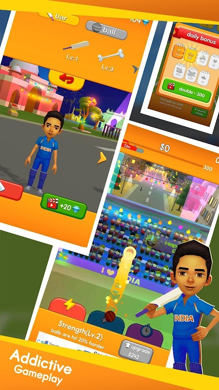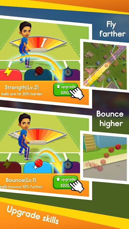 You need to find the best timing and hit your cricket ball as far as possible. The farther you can hit, the more coins and diamonds you can get. Don’t forget to upgrade your skills and unlock interesting items! Now, find the perfect angle and make a great strike!