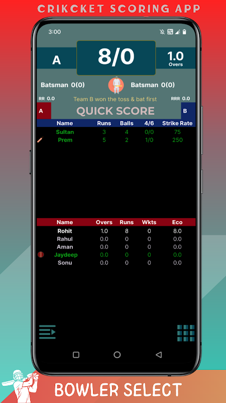4. Batter and Bowler Selection: Easily select the current batsman and bowler from the available list of players. Quick Score enables seamless management of player substitutions during the match.