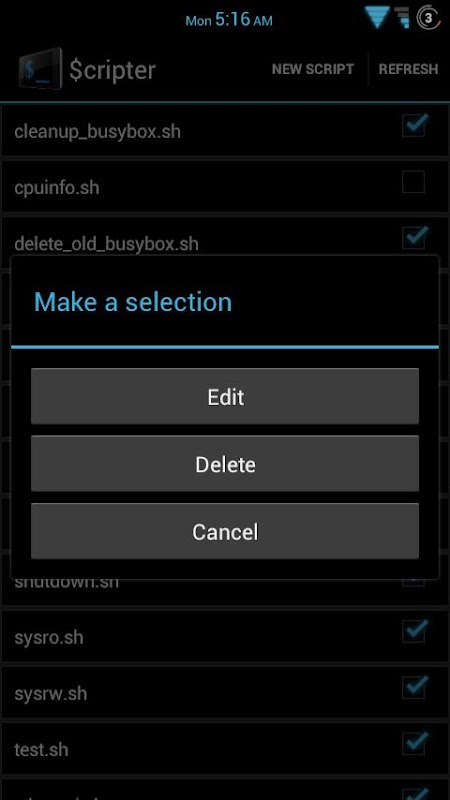 This app allows you to write and run shell scripts. It has run as root capabilities if your android device is rooted. Easily import scripts from multiple directories and create new scripts in specified directories.