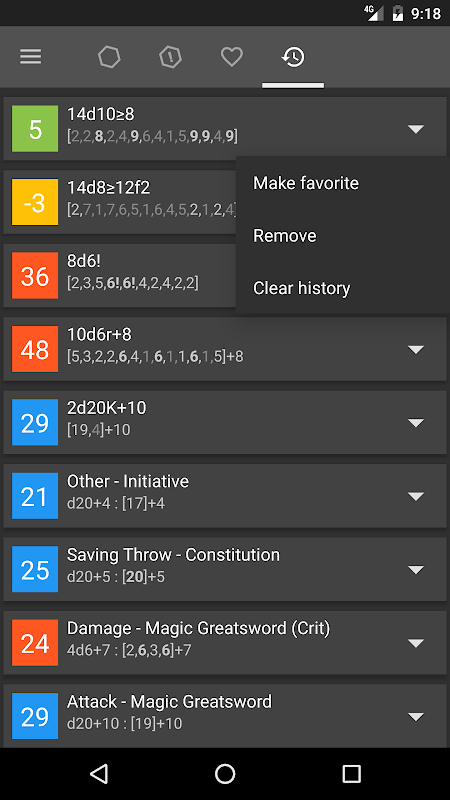 A list of previous dice roll results is also provided, with the most recent result at the top of the list. Tapping an item in the list will cause it to be rolled again. Previous dice rolls can be converted into favorites with a tap of a button.