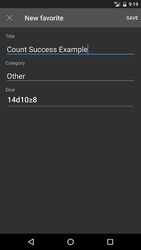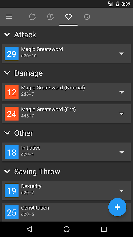 Dice inputs can be saved as "favorites" and rolled with a single tap. Favorites can have any name and can be grouped by category - useful for when you are playing several characters or want to keep things organized.