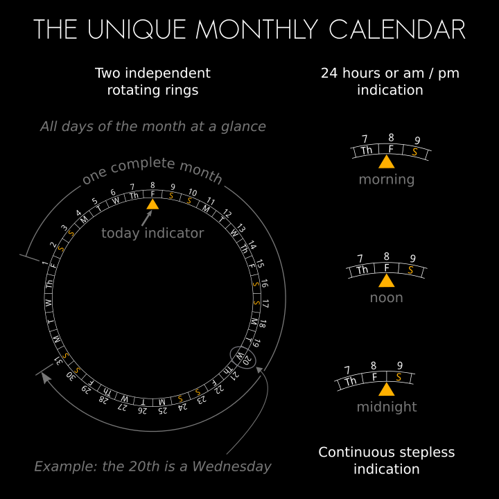 - Current date, day of the week and the unique Cronosurf's monthly calendar