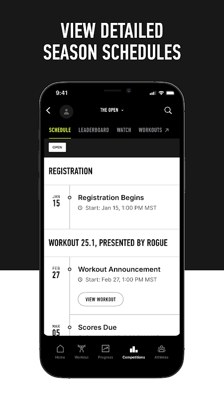 Competition – Join the CrossFit Games season from anywhere. View the schedule, complete the workouts, submit Open scores, track your rank on the leaderboard, stream events, and follow athlete profiles—all in one hub.