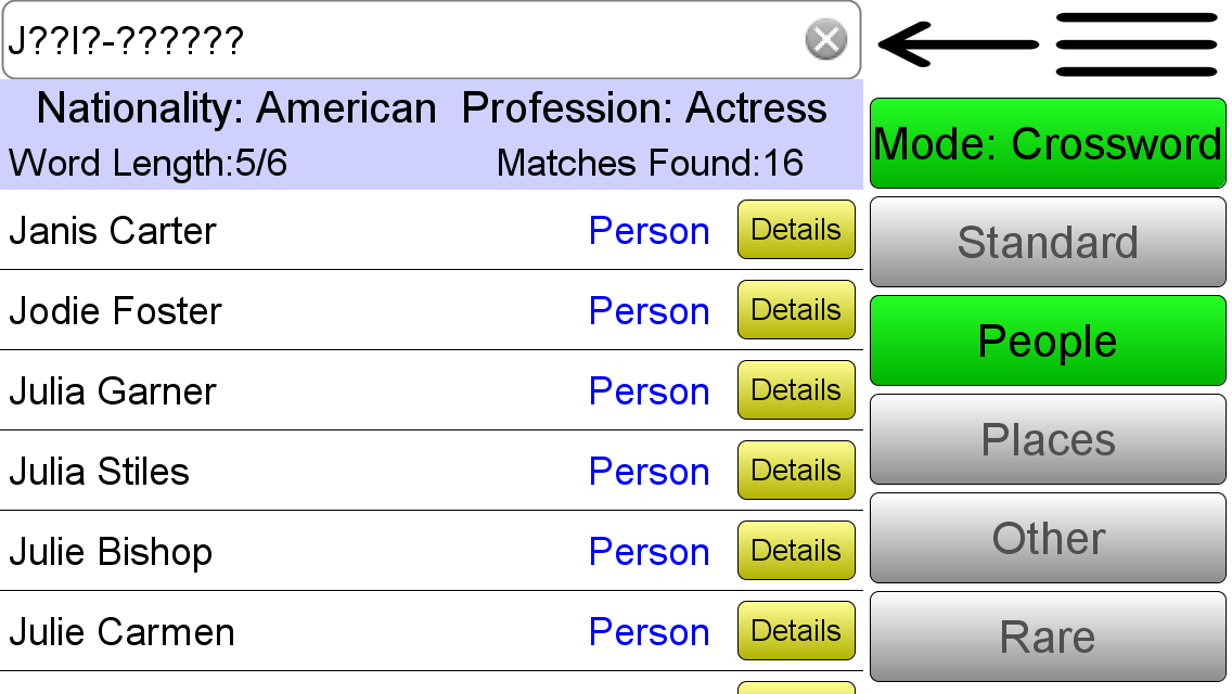 4) Contains 5 different modes for help solving Crosswords, Anagrams, Synonyms, Codewords and Cryptic Crosswords. Codeword mode allows the user to specify which letters are already known (and hence not considered for the unknown letters), and which unknown letters are the same (i.e have the same Codeword number). Cryptic mode contains extra help with many examples