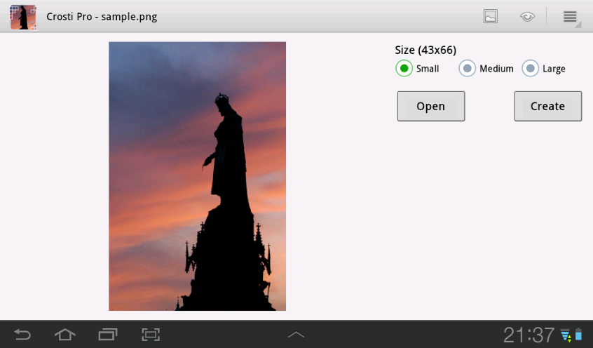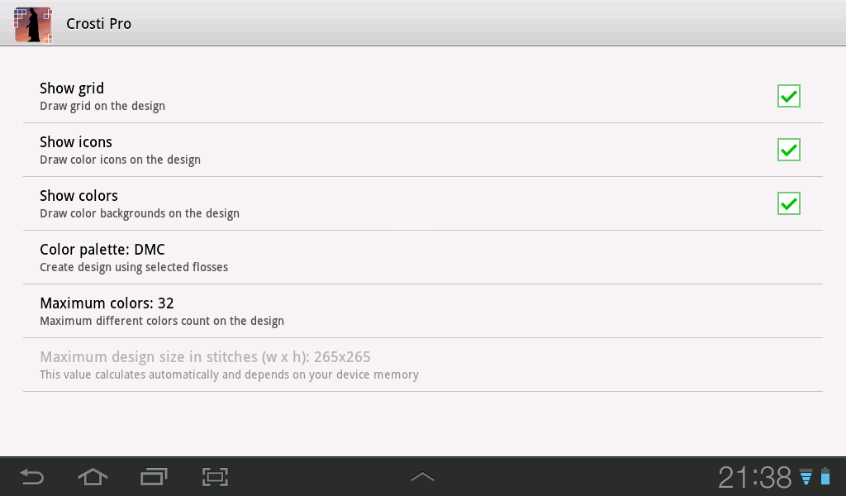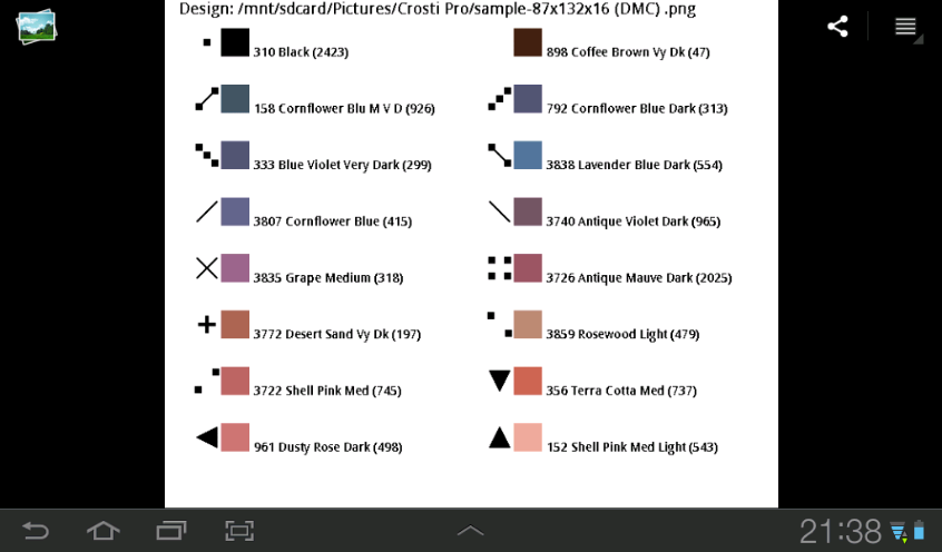 This simple tool allows you to create your own cross stitch design from image using popular DMC, Anchor or Gamma flosses color palette. Just open image, select design and hit Create. Created design will be saved as image and should be opened in the gallery.
