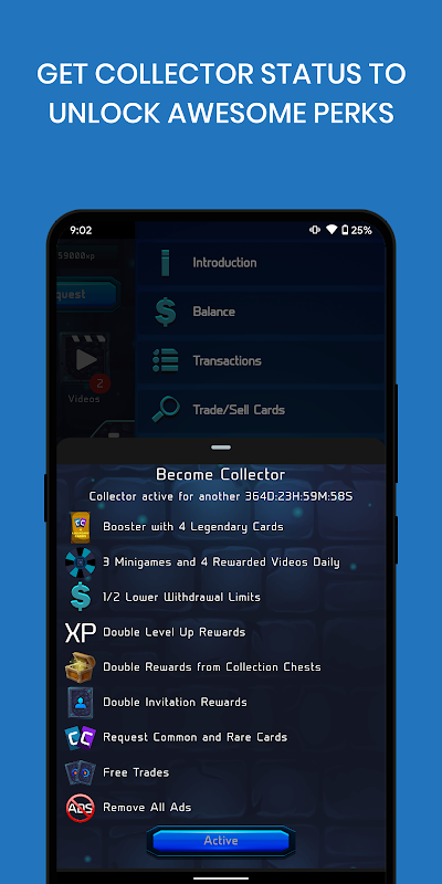 Get Collector Status and access numerous perks such as a special, one-time Booster pack containing four legendary cards, more daily minigames, free trades, DOUBLED level-up, mission, and referral rewards, along with the removal of all ads.