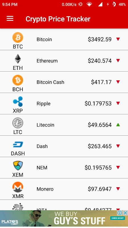 Crypto Price Tracker is a useful app for traders of any Cryptocurrency traded across multiple exchanges, including Bitcoin (BTC), Litecoin (LTC), Antshares/ANS/NEO, AntCoins/GAS, DASH, NEM (XEM), Lisk (LSK), Ripple (XRP), Ethereum (ETH), Ethereum Classic (ETC), Bitcoin Cash (BCH), Veritaseum (VERI), IOTA, EOS, , Vertcoin (VTC), Dogecoin (DOGE), Blackcoin (BC), Monero (XMR), QTUM, Namecoin (NMC), Peercoin (PPC), Bytecoin (BCN), VeriCoin (VRC), Golem (GNT), ZCash (ZEC), Tether (USDT), PIVX, Decred (DCR), Iconomi (ICN), Stratis (STRAT), Waves, Factom (FCT), Steem, BitConnect (BCC), SingularDTV (SNGLS), Round, First Blood (1st), GameCredits (GAME), Melon (MLN), Stellar Lumens (XLM), Ardor (ARDR), Komodo (KMD), VirtualCoin (VC), Siacoin (SC), Emercoin (EMC), Nexus (NXS), BitcoinDark (BTCD), Gulden (NLG), AntShares (ANS), Xaurum (XAUR), BelaCoin (BELA), BitBay (BAY), Chronobank (TIME), ION, Crown (CRW), DigixDao (DGD), etc.