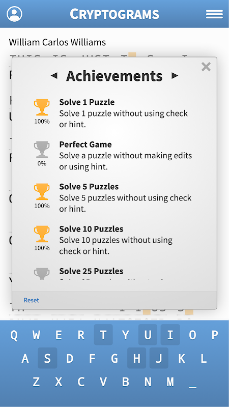 Track your best and average solve times over history with our statistics tracker. Earn achievements as you progress through cryptogram games. Time yourself with our timer or play casually at your own pace. Start with hints, or without!