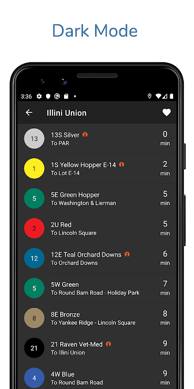 -Alarm: Long-press a bus route to start a timer that will alert you when your bus is near.