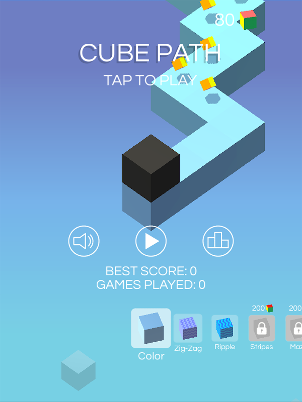 Stay on the path as long as you can. Tap to change direction. Collect mini-cubes to unlock new path designs. If your timing is not perfect, your cube and the path get smaller. If you are perfect 8 times in a row, your cube and path get bigger again.