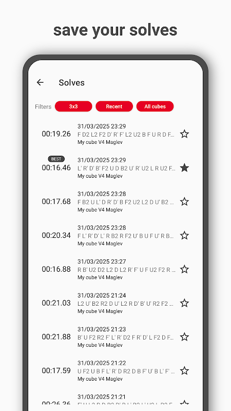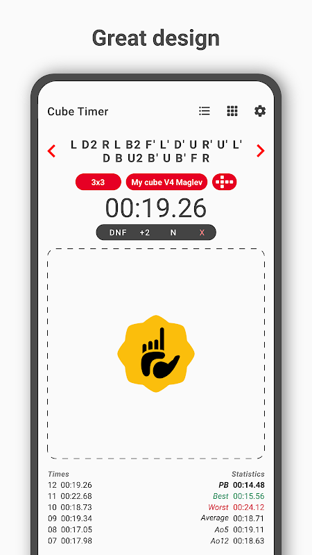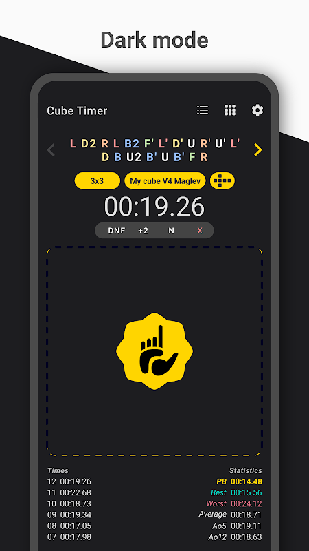 ★ Real time statistics: Average, Ao5, Ao12, Best and Worst time.