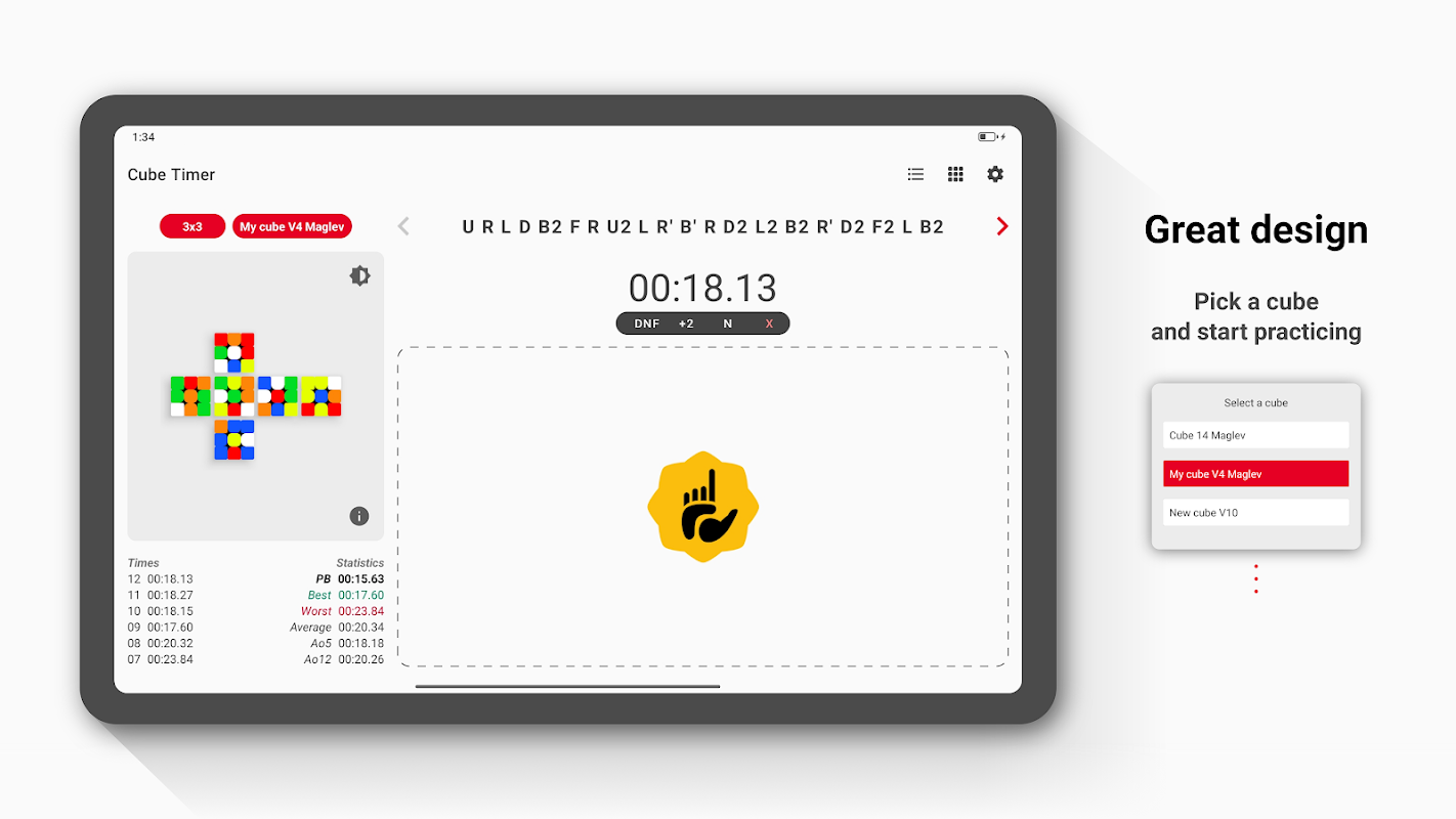 Practice speedcubing and improve your times with this timer for cubes: 2x2, 3x3, 4x4, 5x5, 6x6, 7x7, Pyraminx, Megaminx, Skewb and Square-1.