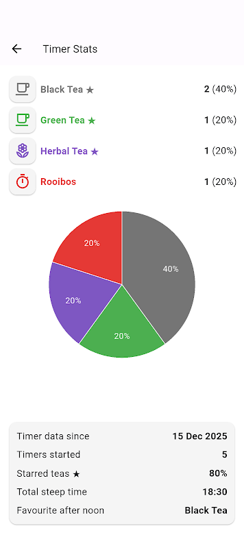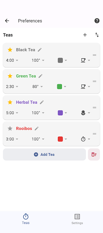 To make the app so quick and easy that you'll actually use it, we have built it with simplicity in mind. Just open the app and tap the button for the type of tea you're brewing. That's it. No need to navigate through complicated menus to find a particular tea, or fiddle with settings... unless you want to customize brew times or add your own favorite teas.