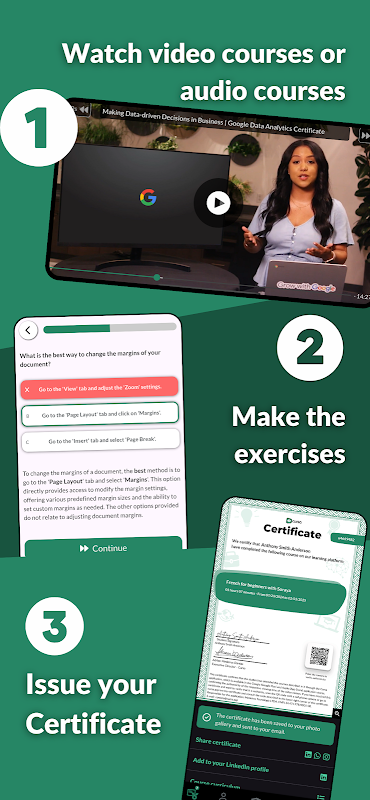 When you watch or listen to your online courses, your progress is automatically saved, whether it's video lessons or audio courses. You'll also find exercises to enhance your knowledge, AI-powered tools to boost your career and receive course reminders, as well as educational articles and stories to complement your studies.