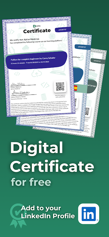 Receive your free digital certificate upon completion of your online course in video or audio. The certificate has a QR Code for validation and is automatically saved in the photo gallery of your cell phone and sent to your email.