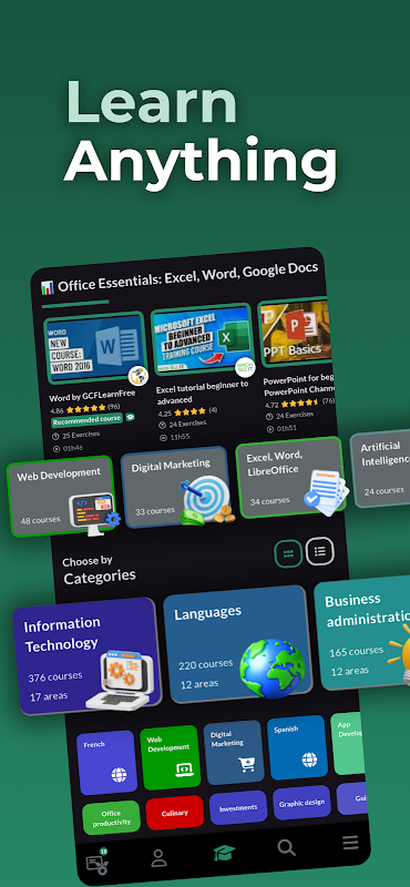 Learn for free: Digital Marketing, Entrepreneurship, Human resources, Investments, Project management, Business Skills, Accounting, Ecommerce and Sales, Finances, Purchasing managements and Political.