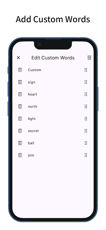 - Custom Words can be sorted and deleted.