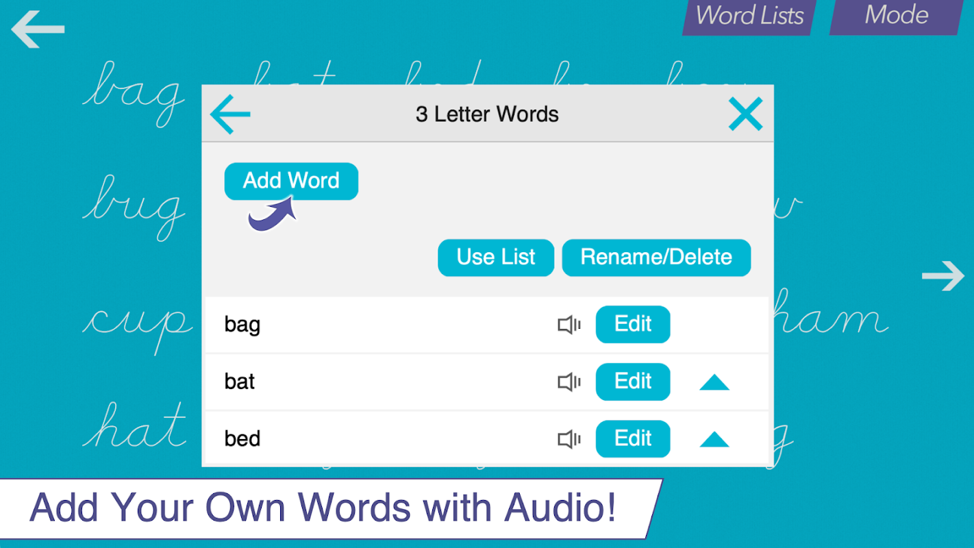 • Ability to create your own word lists (and record audio for each word)