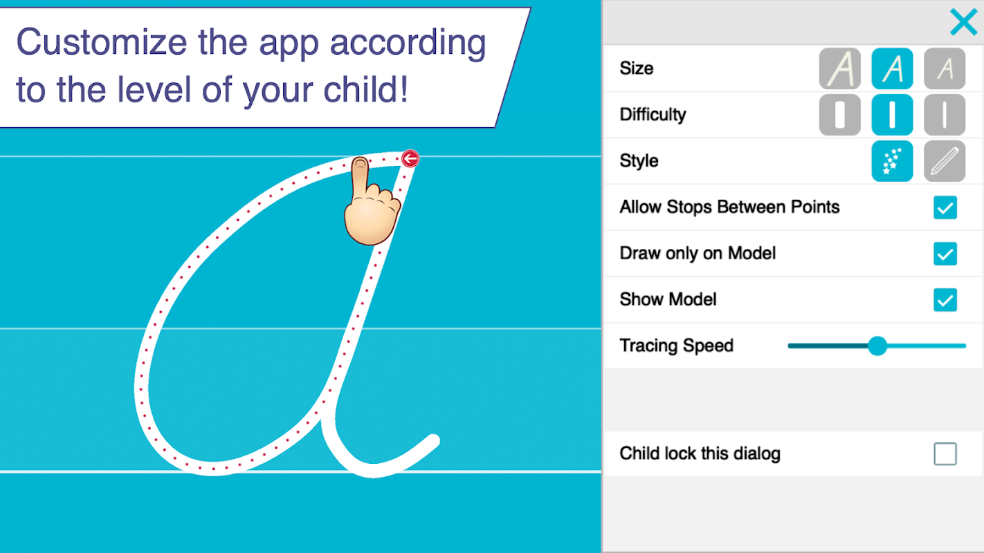 • Multiple parameters to customize the app according to child’s current education level (letter size, difficulty, show/hide model, allow to stop between key points, etc.)