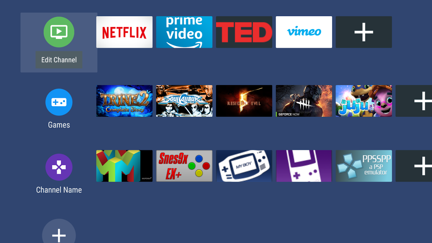 Create your own Android TV channels in the home screen where you can add shortcuts to any app you have installed.