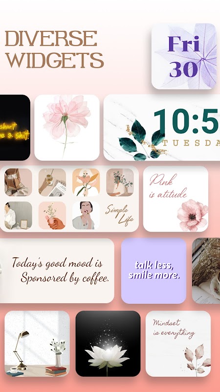 Get inspired by Color Widgets’ extensive collection of themes - which widgets, icons, and wallpapers bundled together to match an aesthetic. Explore themes in broad categories like Minimal, Nature, Neon, Gradient, and Aesthetic.