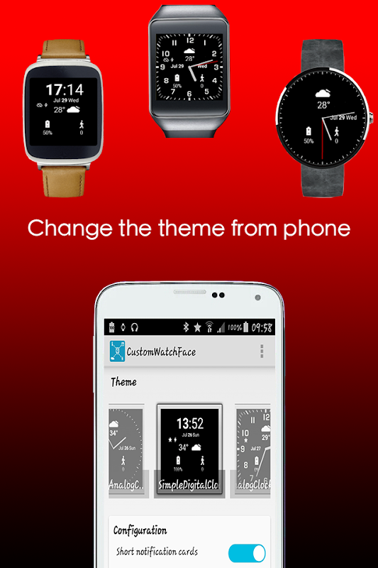 Do you want to change the watch face? Easy for now, CustomWatchFace let you set up multiple configurations from your phone and apply to your android wear for several informations ~