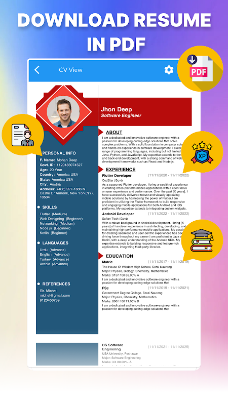 Looking for an easy-to-use resume builder and CV maker? Our Professional Resume Builder & CV Maker app helps you create professional resumes and curriculum vitae (CVs) effortlessly. Quickly generate high-quality, customizable resumes that highlight your skills, education, experience, and achievements. With over 40 professional resume templates and various customization options, you can easily create a standout resume.