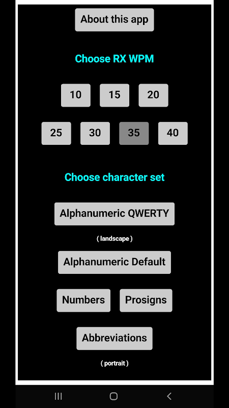 CW Morse code learning Android app is RX only at 10, 15, 20, 25, 30, 35, 40 WPM.