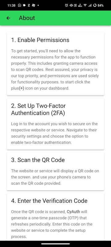 CyAuth adds an extra layer of security to your online accounts by adding a second step of verification when you sign in. This means that in addition to your password, you'll also need to enter a code that is generated by the CyAuth app on your phone. The verification code can be generated by the CyAuth app on your phone, even if you don't have a internet connection.